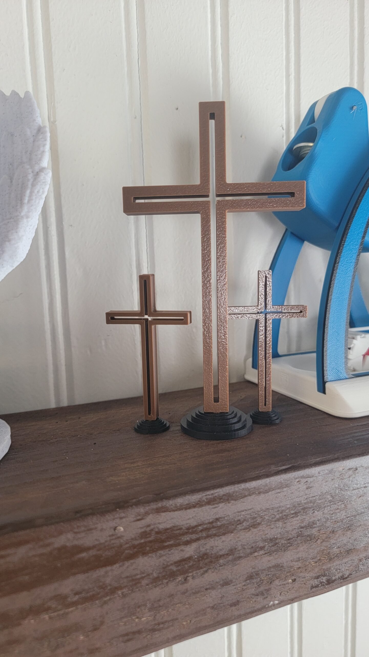 – Cruz de mesa impresa en 3D con diseño moderno y minimalista.