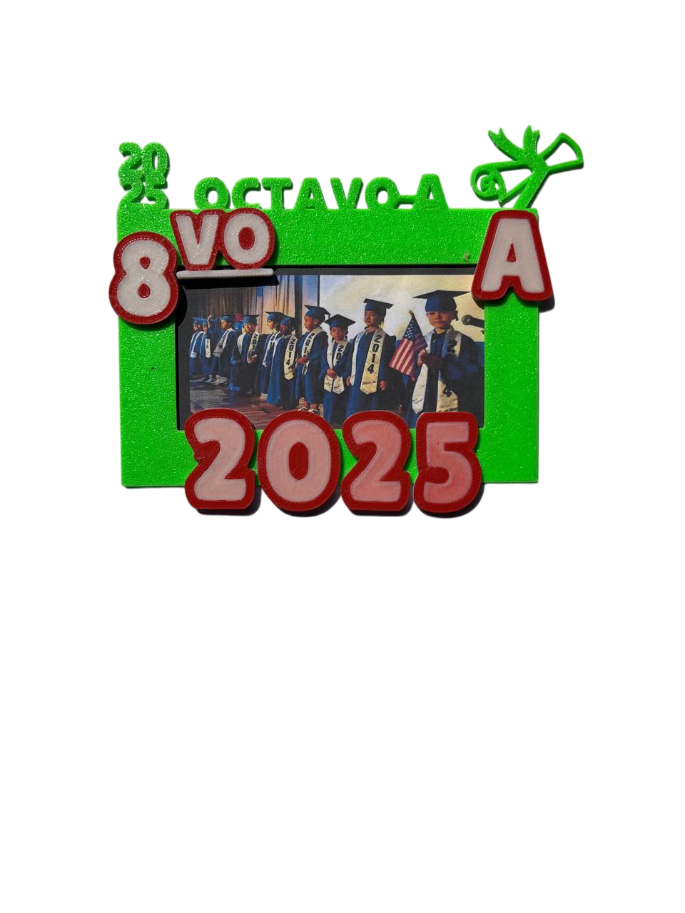 El **Marco 3D “Octavo A 2025” – Modelo Medio** es un recuerdo lleno de color y simbolismo para conmemorar el término de la enseñanza básica.